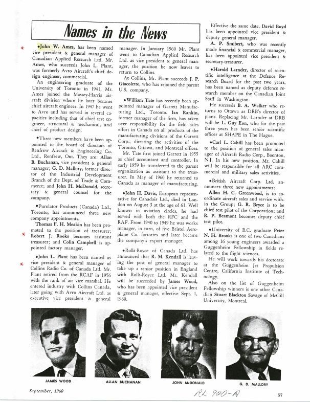pg 57 - Announcement that former Avro design engineer John W. Ames has joined Cdn. Applied Research Ltd. as VP & General Manager replacing John L. Plant. Announcement that former Exec. VP & Gen. Mgr. of Avro Aircraft John L. Plant has been named VP & Gen. Mgr. of Collins Radio Co. of Canada Ltd.General Notes