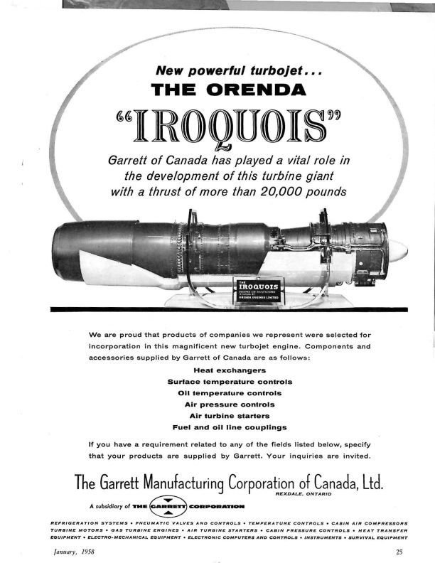 pg 25 Advertisement by The Garrett Manufacturing Corp. of Canada, Ltd. featuring the Orenda Iroquois, with photo of the engine.Publication Details