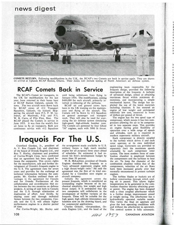 From Canadian aviation 1957 Nov pg 108 - Iroquois for the US - Orenda & Curtiss-Wright sign agreement on Iroquois development; RCAF Comets back in service - Comets back from mods in the UKPublication Details
