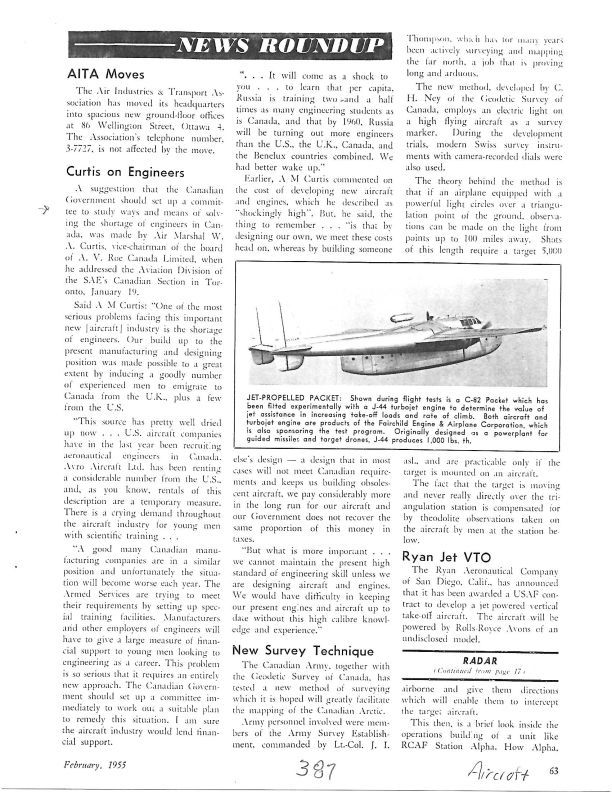 Page 63 Curtis on Engineers. The suggestion that the Canadian Government should set up a committee to study ways and means of solving the shortage of engineers in Canada, was made by Air Marshal W.A. Curtis, vice-chairman of the board of A.V. Roe Canada Limited, when he addressed the Aviation Division of the SAE's Canadian Section in Toronto, January 19, 1955. Said A.M. Curtis: "One of the most serious problems facing this important(aircraft) industry is the shortage of engineers. Our build up to the present manufacturing and designing position was made possible to a great extent by inducing a goodly number of experienced men to emigrate to Canada from the U.K., plus a few from the U.S. This source is pretty well dried up now... US aircraft companies have in the last year been recruiting aeronautical engineers in Canada. Avro Aircraft Canada has been renting a considerable number fro the U.S., and, as you know, rentals of this description are a temporary measure. There is a crying demand throughout the aircraft industry for young men with scientific training"Publication Details