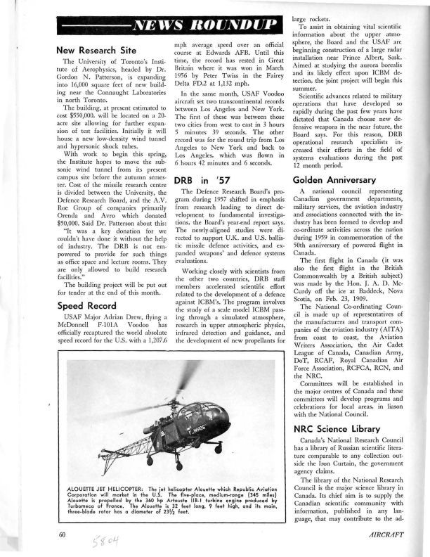 pg 60 New Research Site - reports on A.V. Roe Canada's contribution to the expansion of the missile research centre of the University of Toronto's Institute of Aerophysics.Publication Details