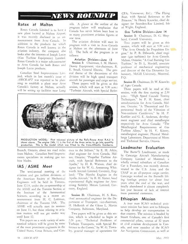 pg 38 - IAS / ASMA Meeting in Toronto with F.H. Keast, chief aerodynamicist for Avro presenting "High Speed Cascade Testing Techniques", H.P. Koehler development engineer and G.E. Anderson chief metallurgist presenting "A Theoretical and Experimental study of the vibration of non-uniform canilevers". "The Avro Orenda Jet Propulsion Engine" by P.B. Dilworth, chief engineer for Avro. "Turbojet Aircraft, with special reference to the Jetliner" by Edgar H. Atkin. Session II Chairman was D.W. Knowles.Publication Details