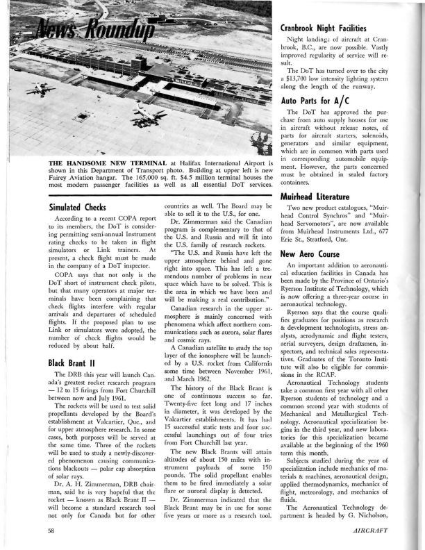 pg. 59 - New Aero Course - Announcement that A.V. Roe Canada Ltd. vice-chairman W.A. Curtis appointed to the advisory committee for new Aeronautical Technology department at Ryerson Inst. Of Technology.General Notes