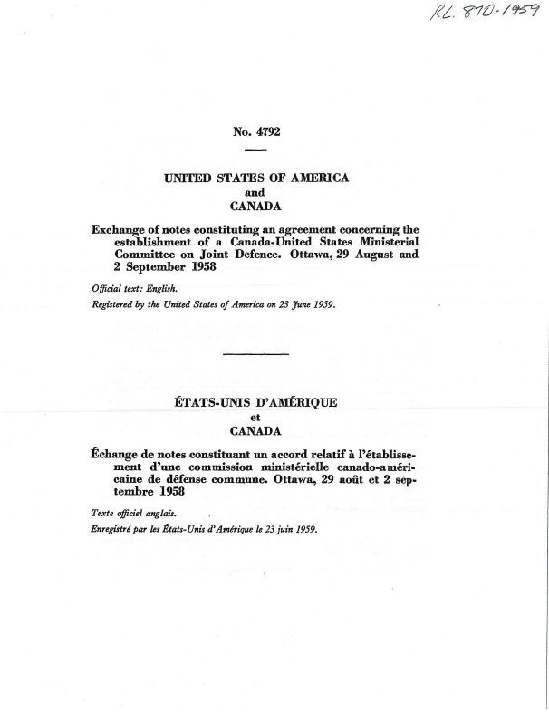 No 4792 - United States of America and Canada - Exchange of notes constituting and agreement concerting the establishment of a Canada-US Ministerial Committee on Joint Defence. Oct 29 Aug and 2 Sep 1958