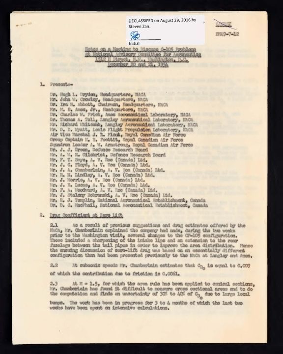 Participants were from NACA, RCAF, DRB, AV Roe, and NAE. Notes on disussions about drag, area of fuselage, bumps causing drag, wave drag, Also suggestions on wind tunnel and free flight model design.