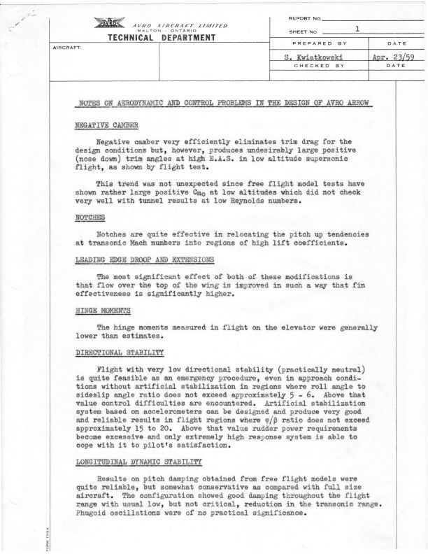 Notes on Aerodynamic and Control Problems in the Design of Avro Arrow