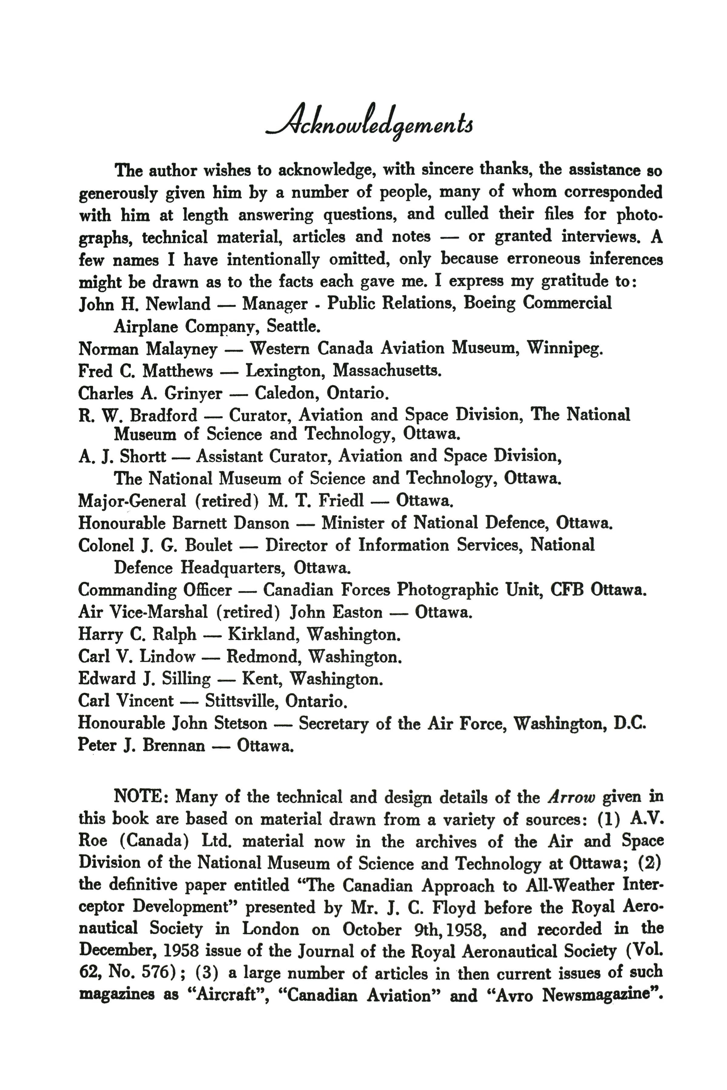 Acknowledgements, Orenda Org chart, plus 10 year Orenda list from 1958. Source is 'Fall of an Arrow', by Murray Peden.