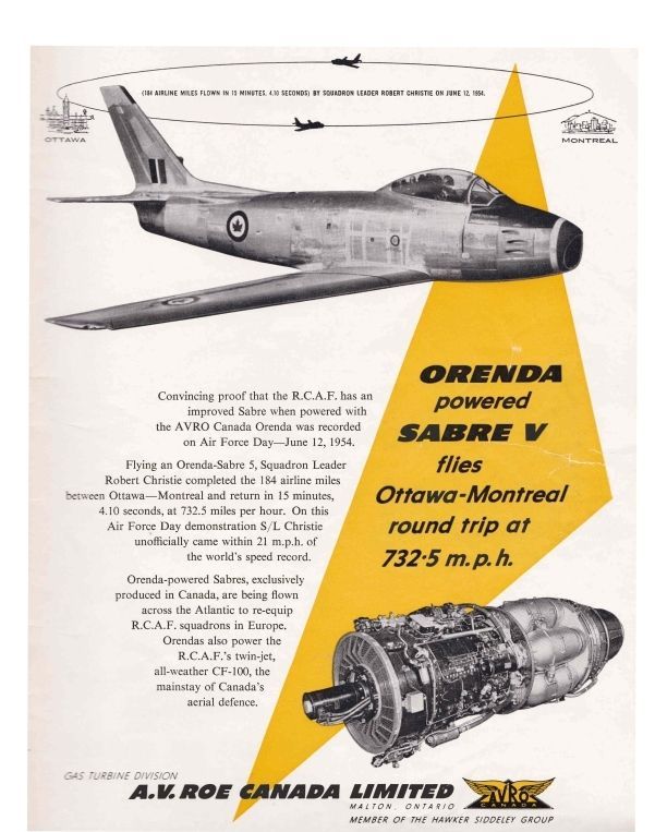 Avro ad for the Orenda powered Sabre V - Orenda powered Sabre V flies Ottawa-Montral round trip at 732.5 mph" On june 12, 1954 the pilot came with 21mph of the world's speed record flying the Orenda equiped Sabre 5.General Notes