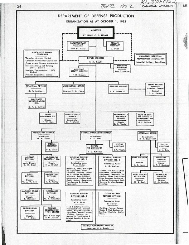 From Dec/52 Canadian Aviation pg 34 - Oct 1952 Dept of Defence Production (DDP) and RCAF organization. From Dec/54 Canadian Aviation pg 42, 98, 114, - dept of Transport & RCAF's Air Material Command including Aircraft Divison DPP. From Jun/54 Canadian Aviation pg 48-49 -RCAF Staff Organization. Also includes Jun/54 Canadian military aircraft.Publication Details