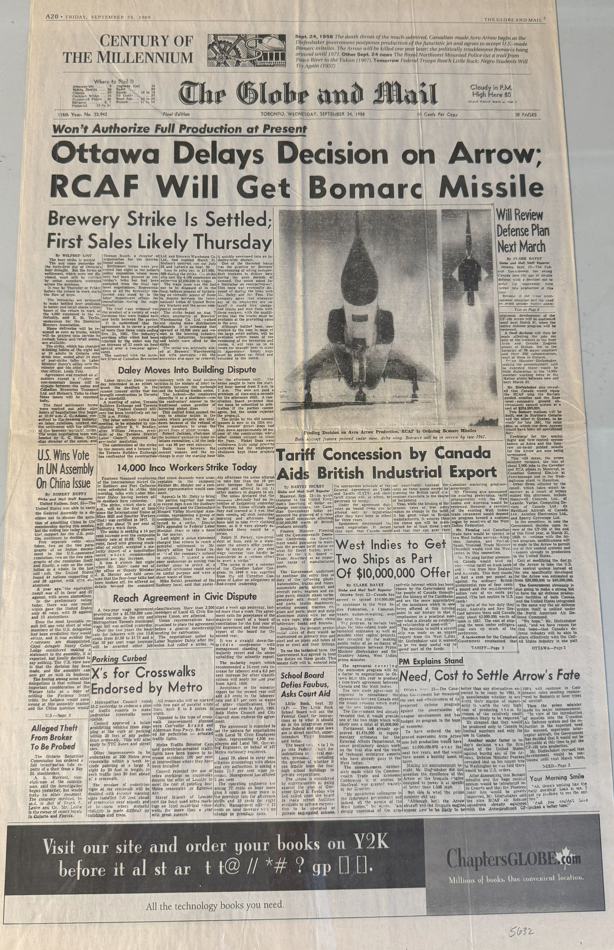 Reproduction (published 24 Sep 1999) of front page of the Sept. 24, 1958 Globe and Mail headlining the decisions concerning the Arrow.General Notes
