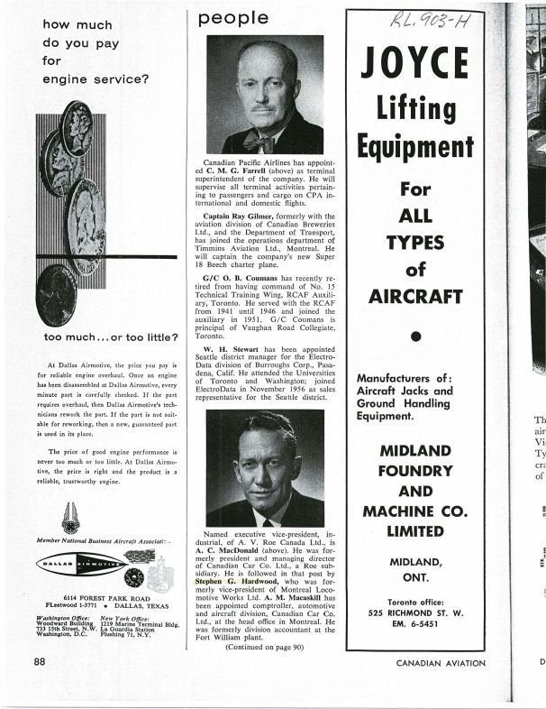 pg 88 A.C. MacDonald named executive VP Industrial A.V. Roe Canada Ltd. A.M. Macaskill appointed comptroller, automotive and aircraft division Canadian Car Co. Ltd. Stephen G. Hardwood takes over as president & managing Director of Canadian Car Co. Ltd.Publication Details