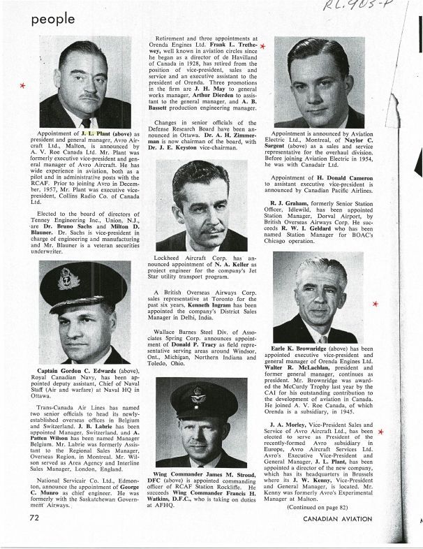 pg 72 J.L. Plant as president and general manager Avro Aircraft Ltd, Frank L. Tretheway retires from Orenda as VP Sales and service and executive assistant to the president. J.H. May becomes General Works Manager, Arthur Dierden becomes asstant to GM. A.B. Bassett becomes production Engineering Manager. Earle K. Brownridge becomes Executive VP and GM of Orenda and winner of McCurdy Trophy last year. J.W. (Jim) Kenny VP & GM Avro in Brussels, Walter R. McLachlan President of Orenda, J.A. Morley elected to serve as President for Avro Aircraft Services Ltd.Publication Details