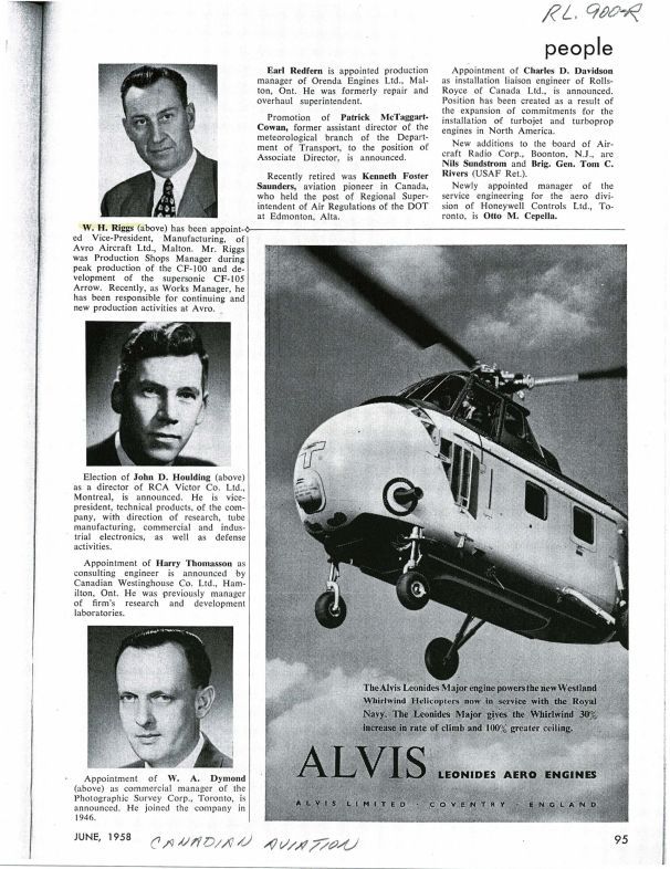 pg 95 W.H. Riggs appointed VP Manufacturing of Avro Aircraft, he was production shops manager during peak prduction of the CF-100 and development of the CF-105 Arrow. Earl Redfern appointed Production manager of Orenda EnginesPublication Details