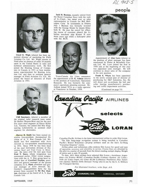 pg 71 Harvey R. Smith to Exec VP Aeronautical Division of A.V. Roe Canada Limited, taking over from Fred T. Smye , Crawford Gordon President and General Manager and J.L. Plant resignPublication Details