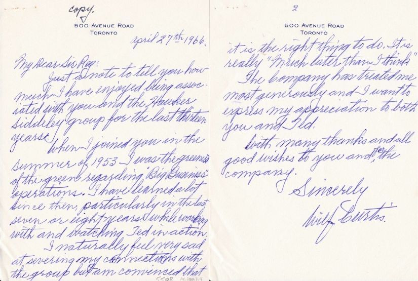 Curtis expresses to Roy Dobson his appreciation of his years of association with Hawker Siddeley. Handwritten, April 27, 1966