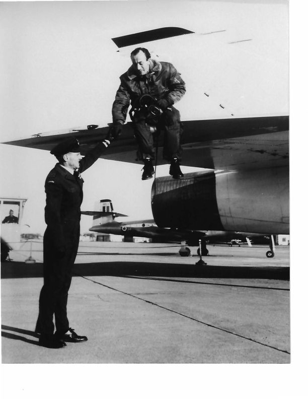 Pilot Peter Cope sitting on Wing of Arrow RL204 on ramp after Diverting to Trenton