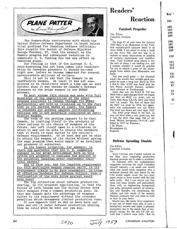 pg 64, 66 Bomarc-Nike conroversy. Defence Spending Doubts - with editors response about CF-100 being able to take off at gross weight from all military airfields from which it was intended it would operate.Publication Details