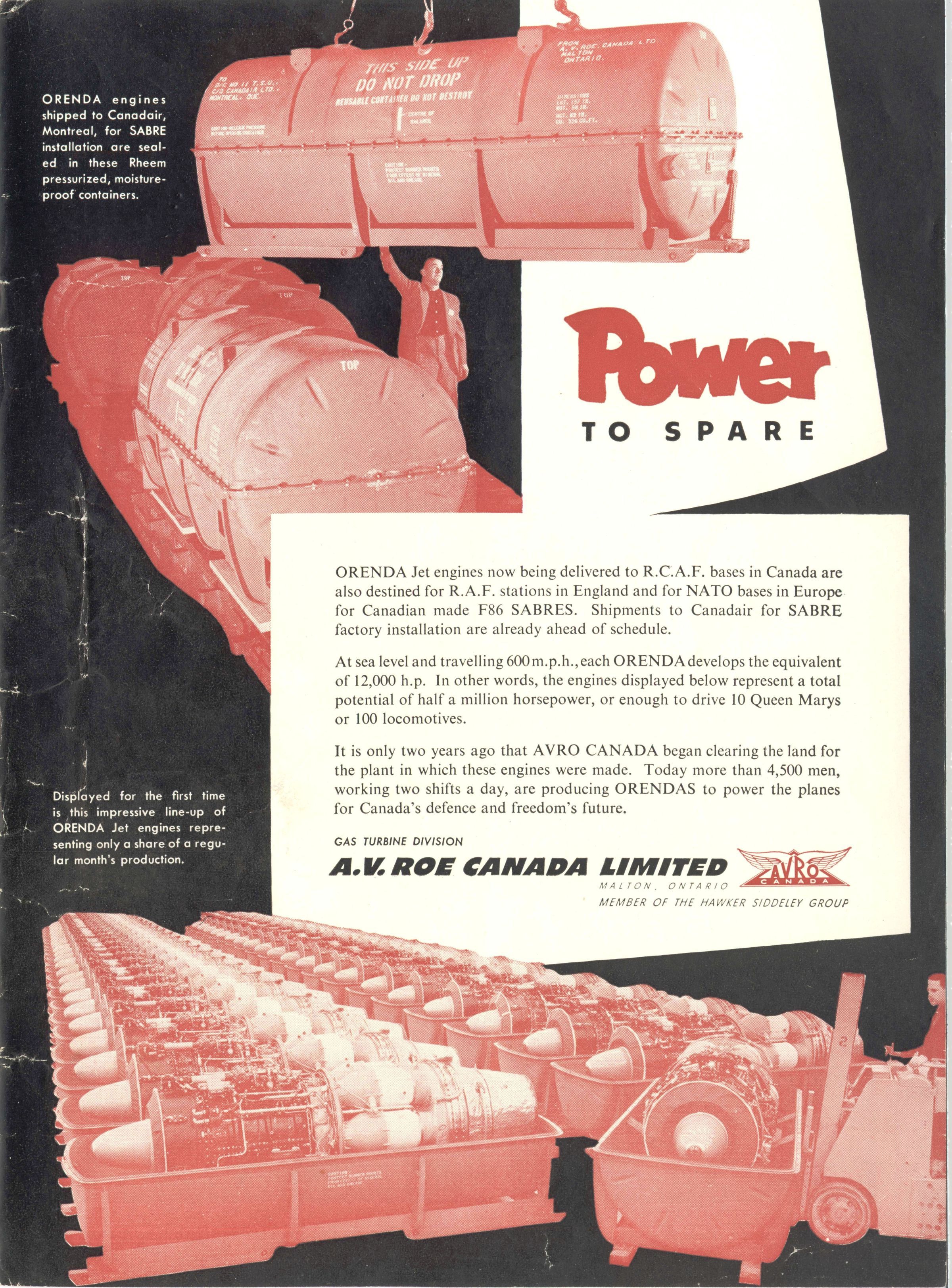 Power to Spare - Advertisement for Orenda Jet engines, now being delivered to R.C.A.F. in Canada and also destined to R.A.F. Sations in England and NATO bases in Europe for Canadian made F-86 Sabres.Entry/Object ID