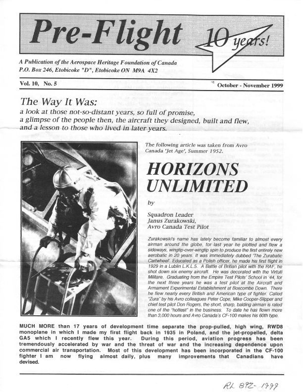 Horizons Unlimited - Zurkowski recounts his personal experience of flying CF-100. Note that there were two different Vol 10 No 5's issued. Names include Conrad Maheau, Anthony Riklicky, Peter Cope, Mike Cooper-Slipper, Don Rogers.Publication Details