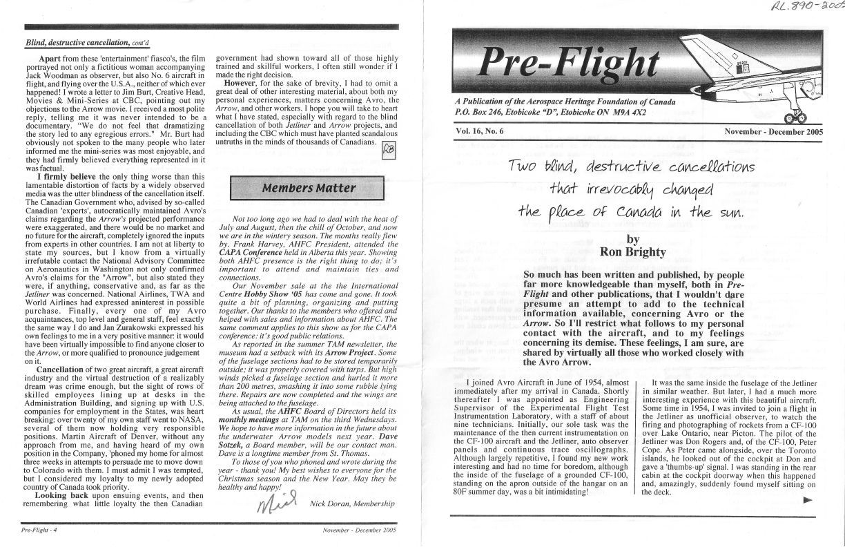 Two Blind, Destructive Cancellations - personal description of the effects of cancellation Includes reference to the CF-100 and Arrow. Names include Ron Brighty, Peter R. Cope, Donald "Don" Howard Rogers, Don Whittley, Janusz "Jan" Zurakowski.Publication Details