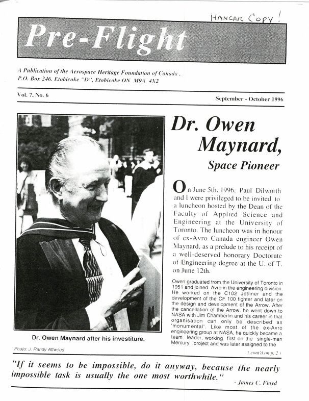 Photocopy - Dr Owen Maynard - Maynard awarded honourary doctorate, story of CF-100 Mks to first flights including supersonic. Jim Floyd includes memories. Herb Young includes "The Lead Sled… The Clunk", image of Jack Woodman at the CNE in 1958 sitting in a replica Silver Dart. Other names include John Hughes, Bill Waterton, Janusz "Jan" Zurakowski.Publication Details