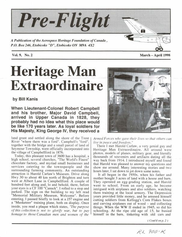 Heritage Man - Author is ex Avro draftsman who started at Avro Feb/50, story about the Memorial Military Museum in Campellford which has a CF-100. Names include Bill Barlow, Roy ThompsonPublication Details