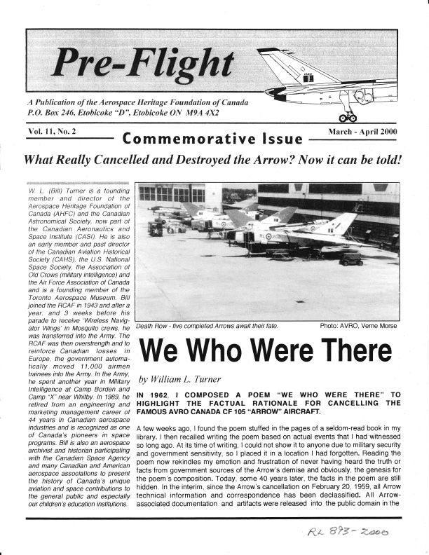 We who were there - An insiders view of how and why the Arrow was cancelled, why the costs jumped. Espionage fears by the US prevented obtaining US technology for the weapons. Names include Verne Morse, Herb Nott, William L. Turner.Publication Details