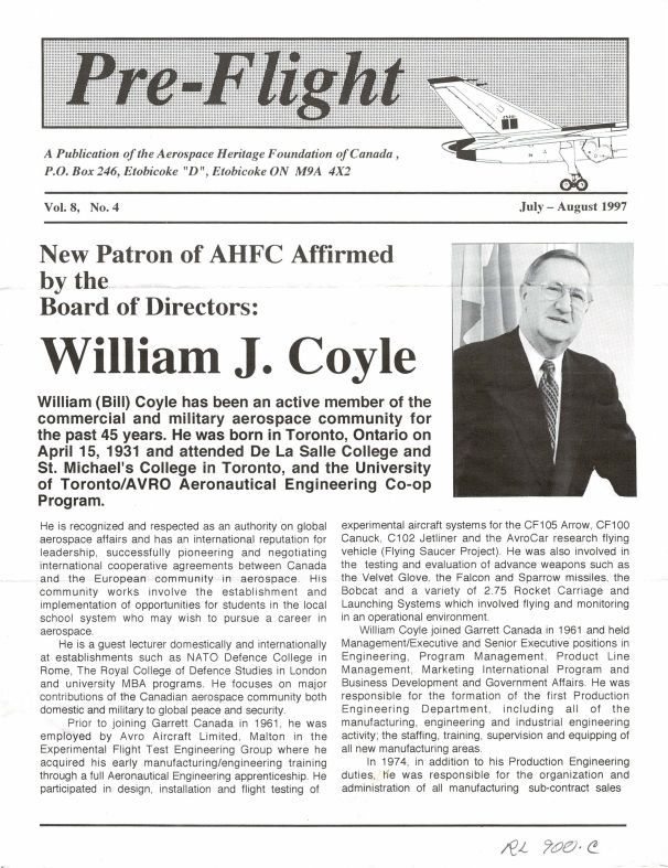 William J. Coyle career with Flight Test Engineering at Avro Aircraft Ltd highlighted. Obit for Ron Kitchen who was involved in the radar design of the Canadian Forces Sabre and Avro Arrow.Publication Details