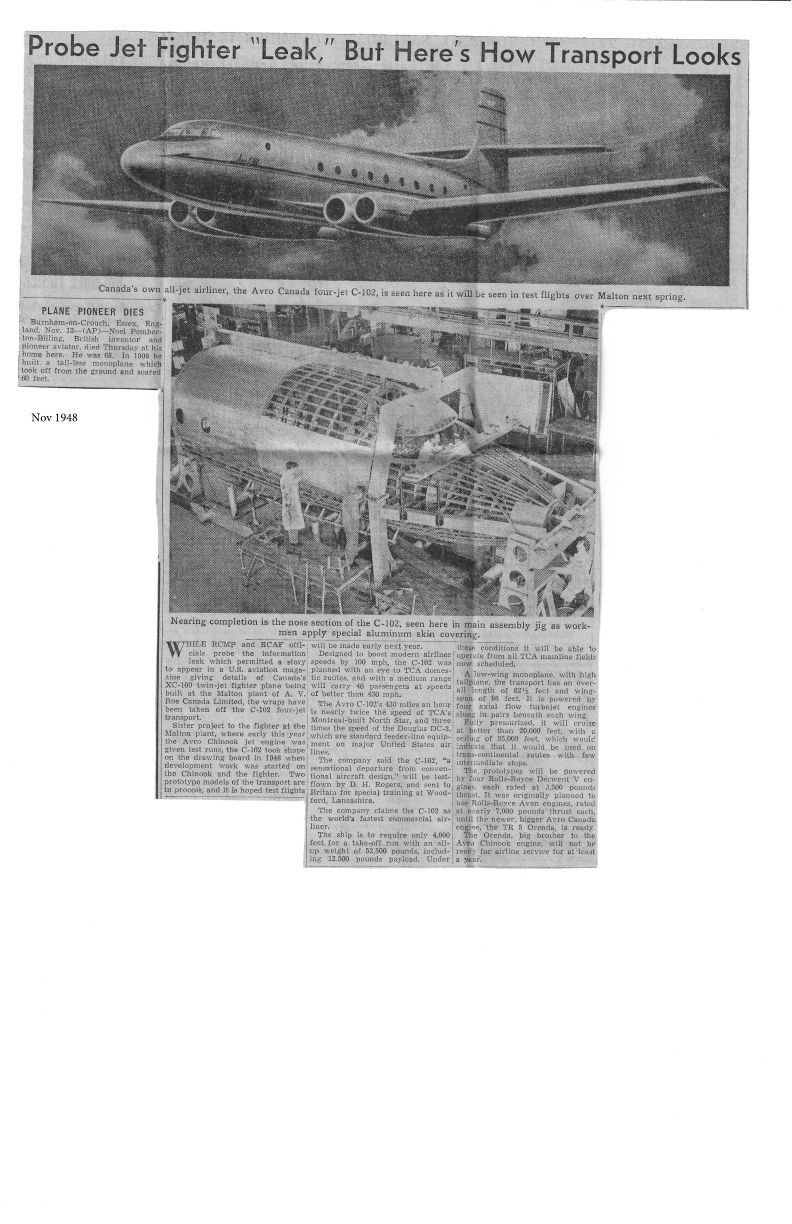 Discussion about RCMP probing leak of XC-100 jet fighter info to American aviation magazine and description of Jetliner. Chinook mentioned. Artist image of Jetliner and photo of nose section nearing completionGeneral Notes