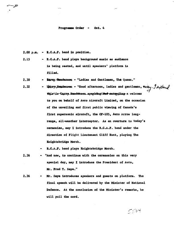 Speaker's notes for master of ceremonies at the Arrow unveiling ceremony. Names include Larry Henderson & Fred Smye.