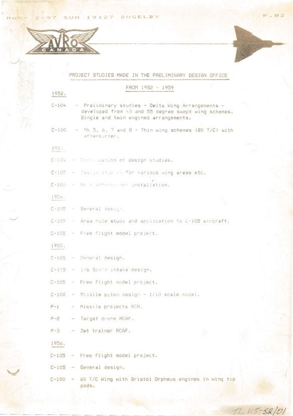 Index by years 1952-1959 of design studies prepared by the Preliminary Design Office. Index includes references to studies studies made for the C-104, C-100, C-105, P-1, P-2 ,P-3, P-4, P-7, P-8, P-10, P-11, P-12, P-13, P-15, P-17, P-19, P-20 and various wind tunnel programmes. Not that this is a very poor quality photocopy.