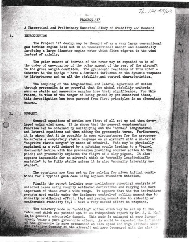 Incomplete Commentary on Stability and Control of All-Wing Project Y Airplane. Graphs are poor photocopies-difficult to read