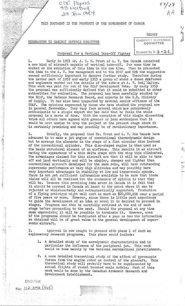 Early developments of JCM Frosts VTOL concept are proposed to be funded by the RCAF, developed in stages to maintain control. Personnel from Avro to be loaned to various Government groups while some work is conducted at Nobel.