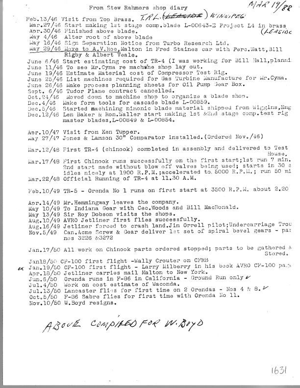 Stew Rahmer's shop diary from 1946 to 1974 lists many dates and event of historical interest. Names include George Best, Winnett Boyd, Sid Britton, Earle K. Brownridge, E.C. Busby, Don Caple, Val Cronstedt, Wally Crouter, Murray E. Davis, Murray E. Davis, Paul B. Dilworth, C.E. Elliott, T.J. Emmert, W.G. (Graham) Eves, L.B. Gray, C.A. Grinyer, C.A. Grinyer, Bill Hall, Wils Hambly, Frances Henry "Harry" Keast, Douglas W. Knowles, Mark Lonsdale, F.W. Luker, Bill MacDonald, Cy Marsden, Jack May, Ken McGuire, Ken McGuire, Walter R. McLachlan, Walter R. McLachlan, Dr. Alex Muraszew, M.C. Nix, Jim Orrell, Pete Peterson, R.G. Plante, Bill Rigby, Fred Staines, R.F. Tanner, Freddy Tarnawetski, Fred Taylor, F.L. Tretheway, Albert Veale, Ron Walker, Perc Watts, Cecil (Cec) Woods plus a few people who are missing first names.