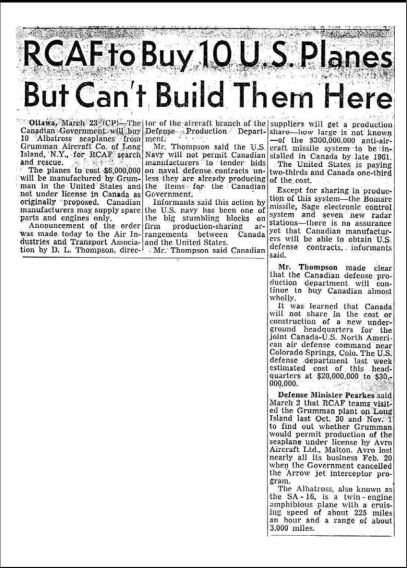 The government purchases 10 seaplanes from the US, with no opportunity to build in Canada under license. Canada may supply spare parts and engines only.General Notes