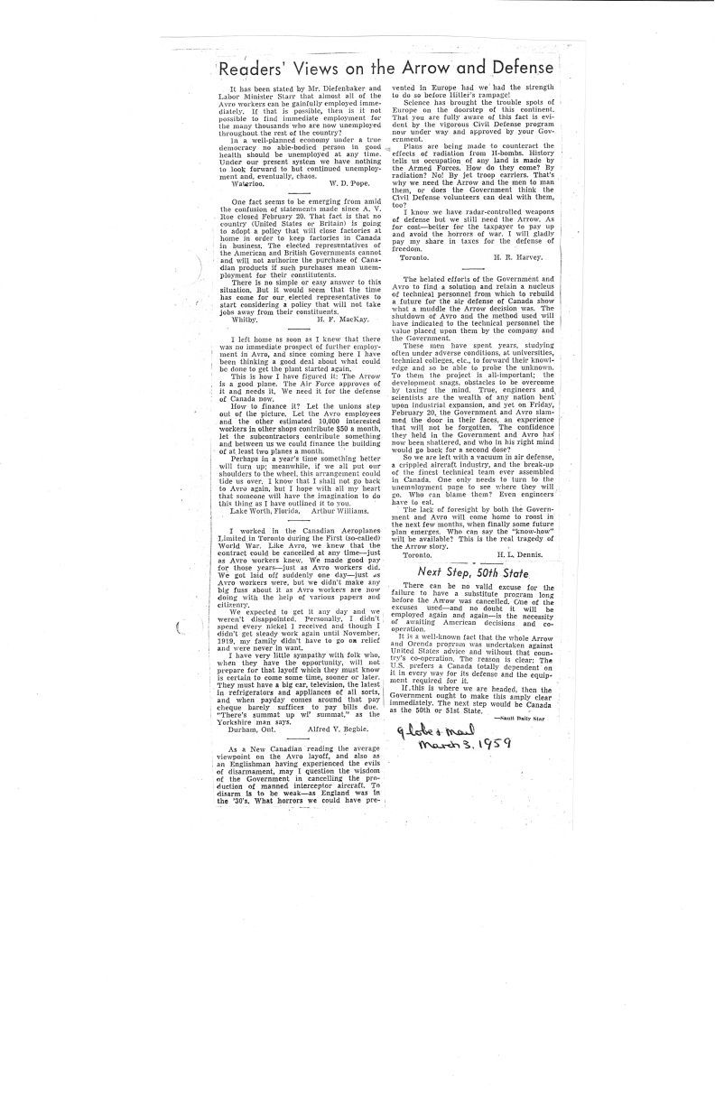 Reader's views on the Arrow and Defense - Mar 3, 1959Entry/Object ID