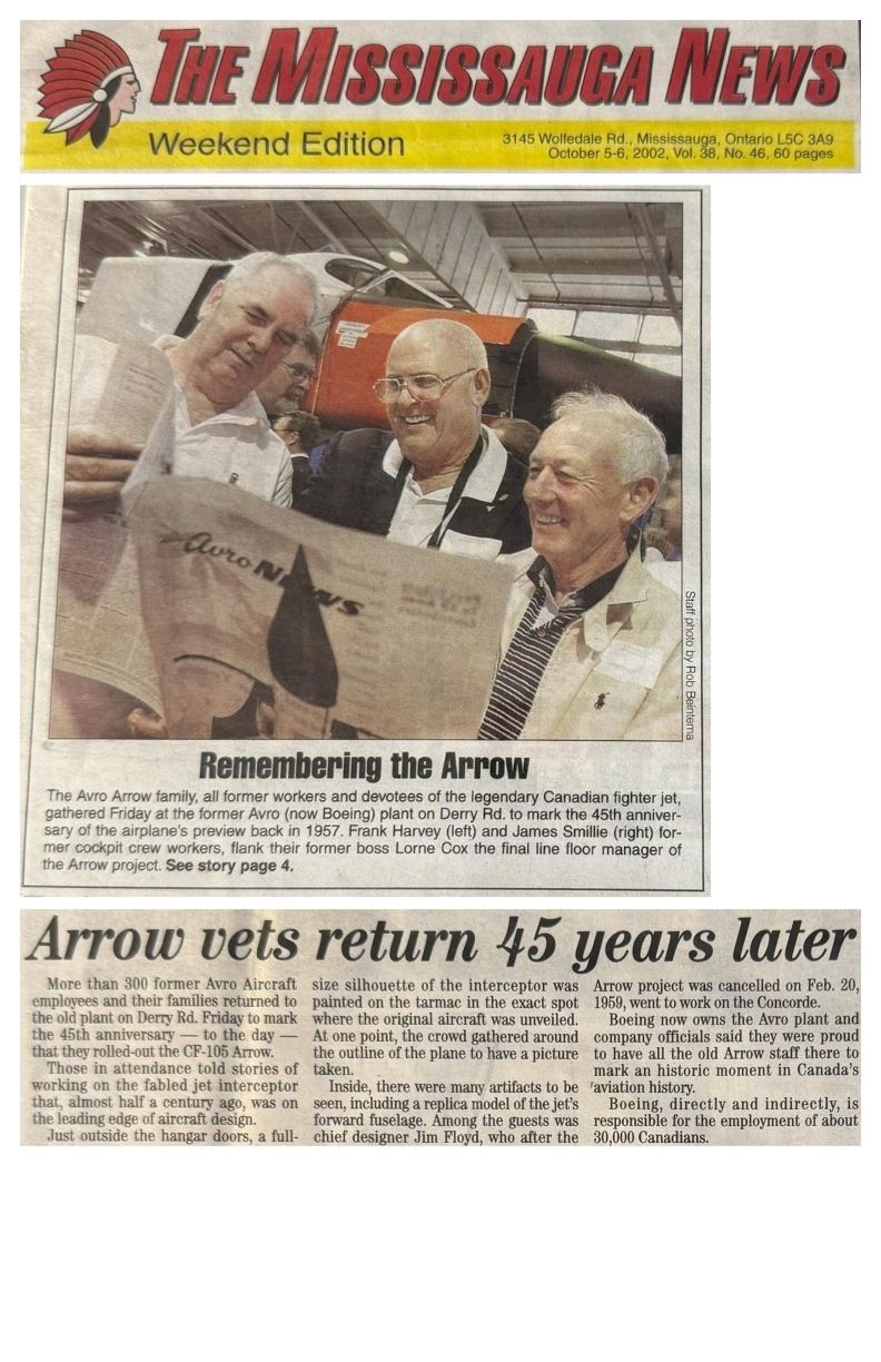 Newspaper article about former Avro employees gathering to at factory site to commemorate the 45th anniversary of Arrow roll-out. Names include Lorne Cox, James "Jim" Charles Floyd, Crawford (Jr.) Gordon, Frank Harvey, James Smillie.Publication Details