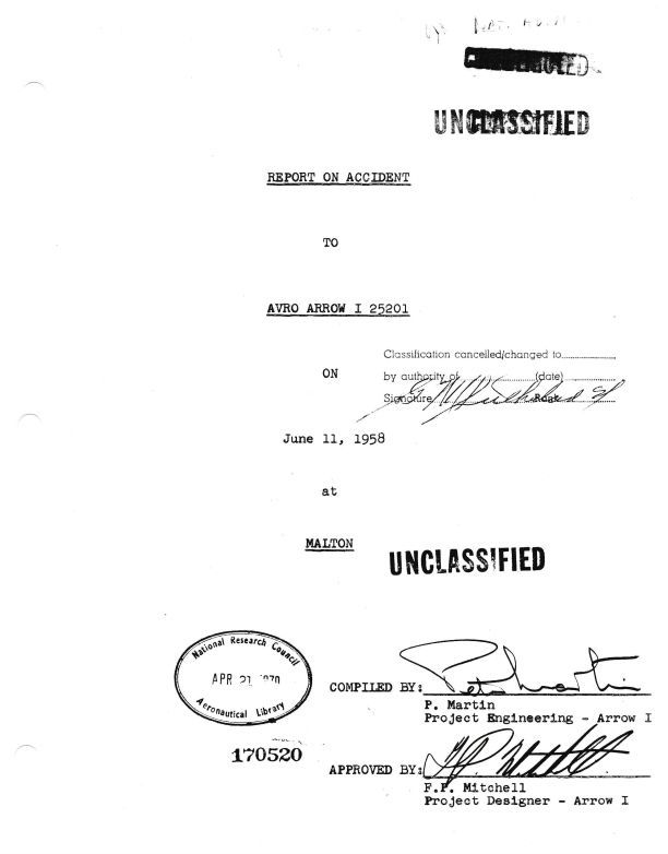 Part 1 of 2 of Report on Landing Accident of Arrow Aircraft 25201; Part 1 Describes Details of the Accident and Part 2 Describes Details of Actual Damage to the Aircraft and Repairs Required. Precise cause of the left landing gear failure to extend properly is unknown. Report approved by F.P. Mitchell.