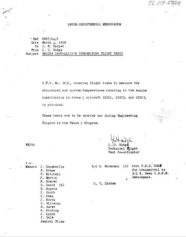 Specifications to measure the Structural and System Temperatures relating to Engine Installation on Arrows 25201,25202 and 25203. Request for Test No. 5031 for Temperature Tests. Report sent to J. Chamberlin, F. Brame, F. Mitchell, P. Martin, R. Bowyer, D. Scard, D. Rogers, J. Scott, J. Ames, J. Booth, S. Whiteley, E. Duret, A. Binding, J. Lynch, J. Gale, C.V. Lindow, S.K. Harper, G. Waterman