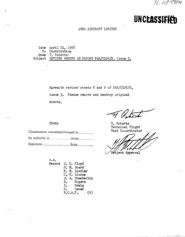 Revised sheets 8&9 of FAR/C105/2 Regarding Purpose of First Series of Flights of CF-105. Names include James "Jim" Arthur Chamberlin, I. Craig, James "Jim" Charles Floyd, Robert N. (Bob) Lindley, G. Oscar, T. Roberts, Donald "Don" Howard Rogers, D.N. Scard.
