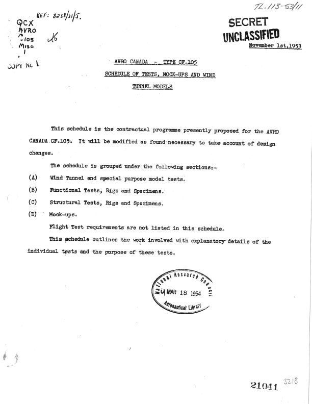 Schedule of Tests, Mock-Ups and Models of the CF-105