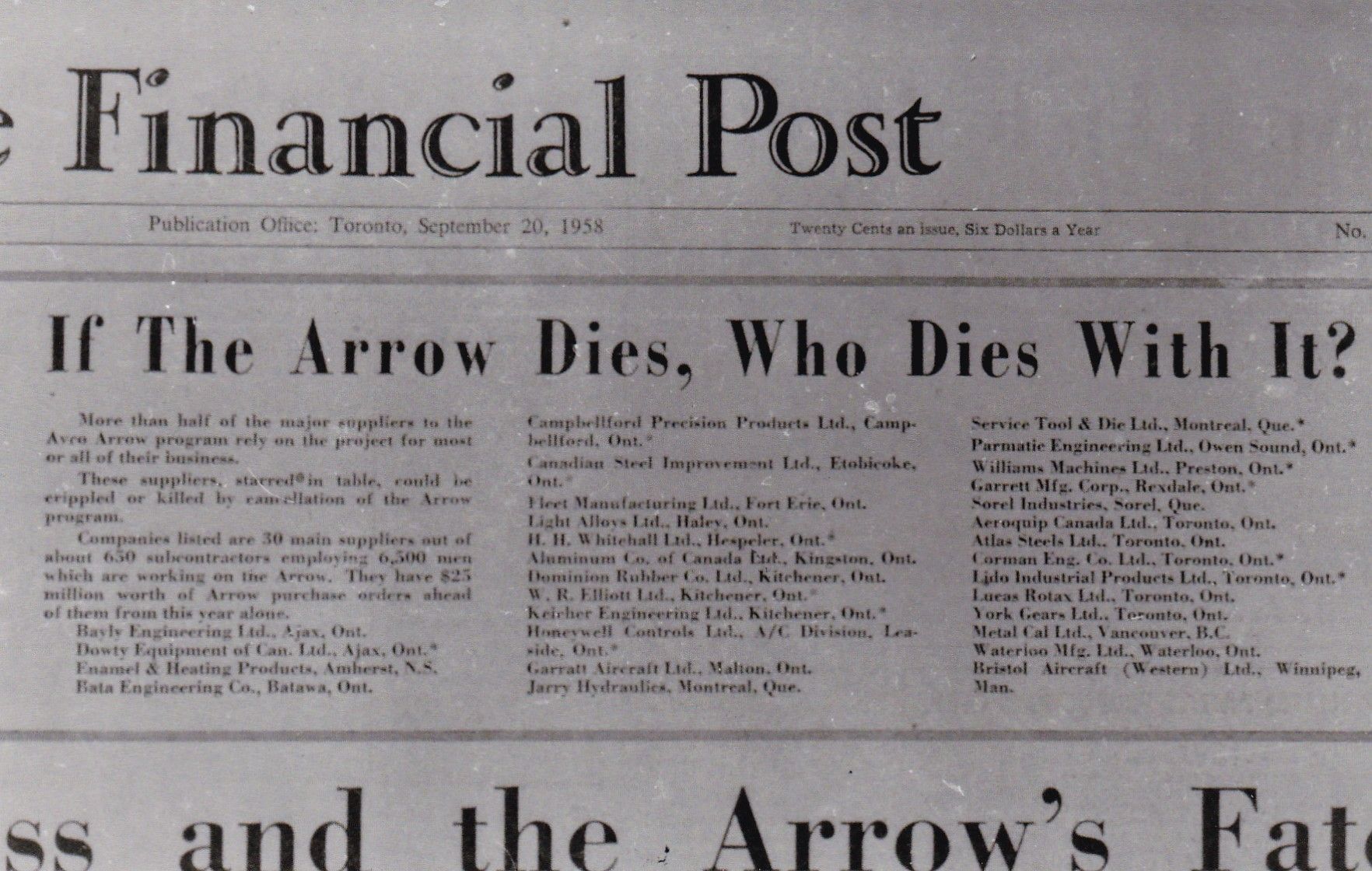 Sep 20, 1958 Financial Post, If Arrow Dies, Who dies with it?