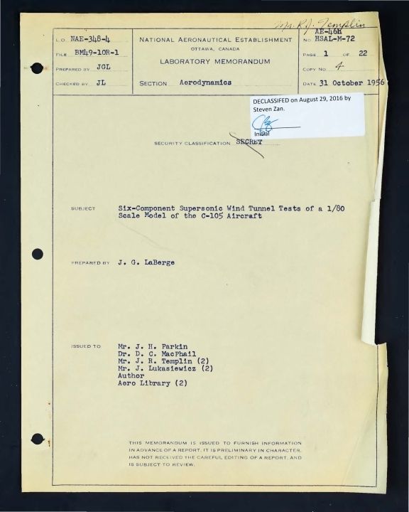 Six-component supersonic wind tunnel tests were carried out on a 1/80 scale model of the C-105 aircraft at four Mach numbers. In all, 27 model configurations were investigated over a period of three months requiring a total of 1991 tunnel runs. This memorandum contains the results of these tests in the form of basic plots, cross plots and final aerodynamic derivatives. In order to expedite the publication of the data, the results are presented without detailed analysis.