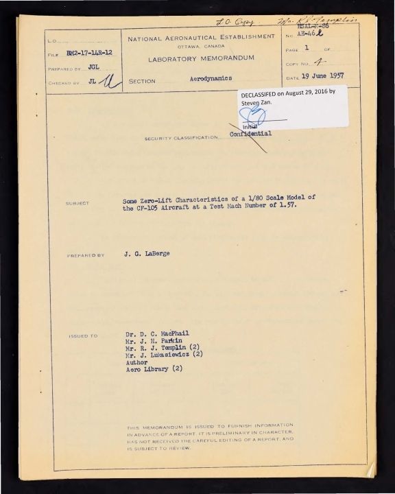At supersonic speeds the values of C sub m sub o predicted and measured by the N.A.E. were found to disagree with the values measured by the N.A.C.A. In an attempt to discover a possible explanation for this discrepancy a detailed investigation was made in the area of interest and at a Mach number of 1.57. The effect of tunnel flow angularity was assessed by testing the model in both the inverted and upright positons while the effect of flow through the rather long and narrow intake ducts of the model was determined by testing the model with and without fairings over the intakes. In addition the effect of duct flow on the drag was determined at zero lift.