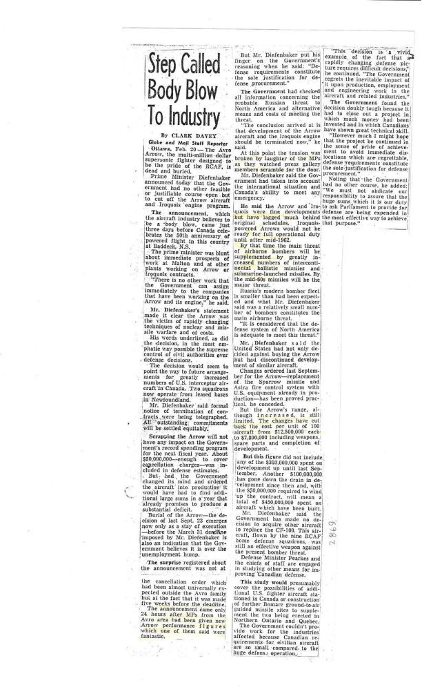 From Globe and Mail 1959 February 21 pages 1,2 - Dief states cancellation based on defence issues only, as Arrow would not be operational until 1962 by which time missiles will become the major threat.General Notes