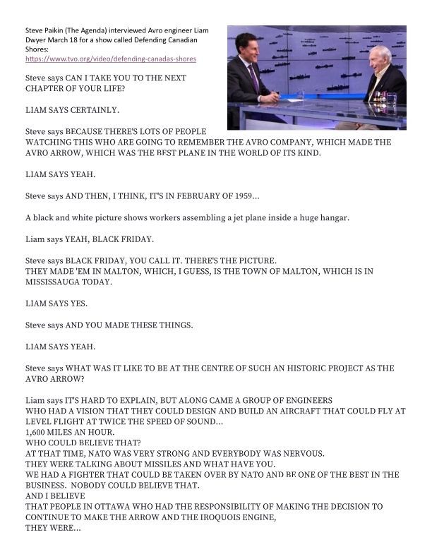 Steve Paikin (The Agenda) interviewed Avro engineer Liam Dwyer March 18 for a show called Defending Canadian Shores
