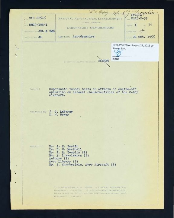 Supersonic wind tunnel tests on the effects of engine-off operation on lateral characteristics of the C-105 aircraft. Report AE-46e HSAL-M-59