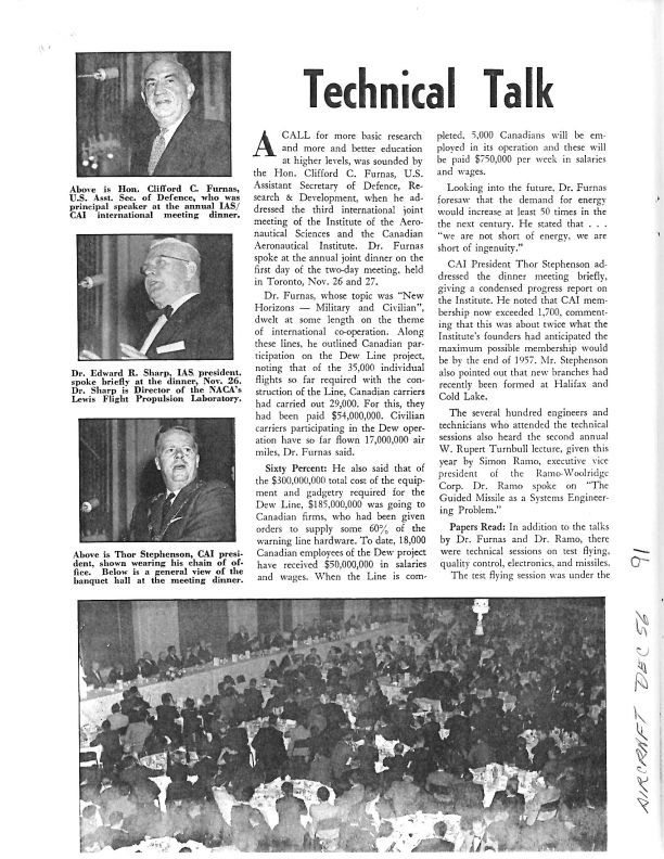 pg 43-44 Summary of papers presented at dinner meeting of the Institute of the Aeronautical Sciences and the Canadian Aeronautical Institute held on Nov 26 and 27, 1956. Details of the Canadian Dew Line construction costs were presented.In attendance were W.S. Longhurst, Canadair's chief of flight operations, Donald H. Rogers, Avro Aircraft chief of flight operations, Harold G. Dickie, supervisor quality review for Pratt & Whitney Aircraft Co. Ltd., R.D. Richmond, chief development engineer and J.F. Perrier missle systems engineer-both of Canadair Ltd.. In the audience are photos of J.C. Floyd of Avro Aircraft Ltd.,F.H. Keast, Orenda Engines Ltd., E.B. Schaeffer, Canadair Ltd., S. L. Britton, Orenda Engines Ltd.General Notes