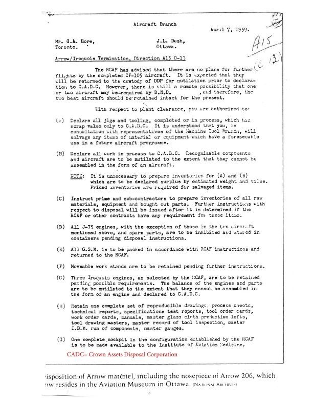 Directives to keep one Arrow nose (206), one set of reproducible drawings, 2 Iroquois, 2 complete planes until further notice