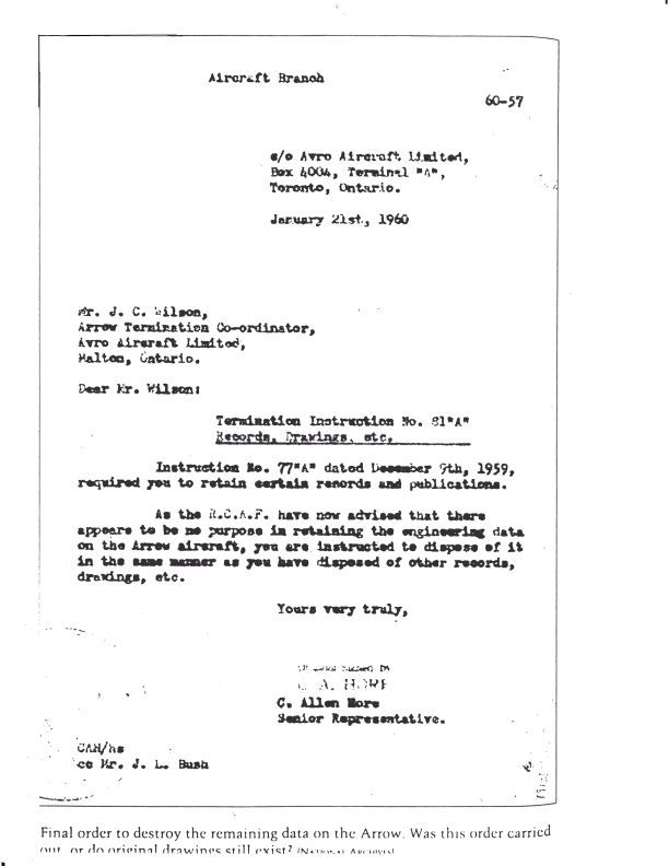 Notice to dispose of Arrow engineering data given to Avro. Names include J.L. Bush, J.C. Wilson.